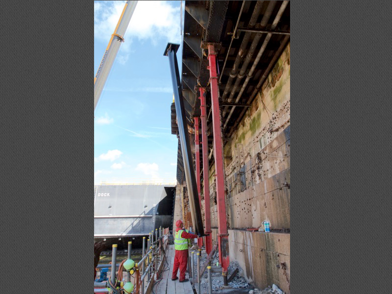 The supporting columns to the dockside crane were badly corroded and need to be replaced. Rather than replicate the existing columns which were built up I sections, braced between themselves and back to the dock wall, I chose to use hollow circular sections that could take the weight without bracing. They also perform better in corrosive conditions. Longitudinal bracing was provided by diagonals in the centre two bays, chosen so that they would be unaffected by temperature movement in the overhead beam. This allowed very rapid replacement of the existing columns. Installation taking less than half an hour per column. The work included the back boards to the yokohama fenders.