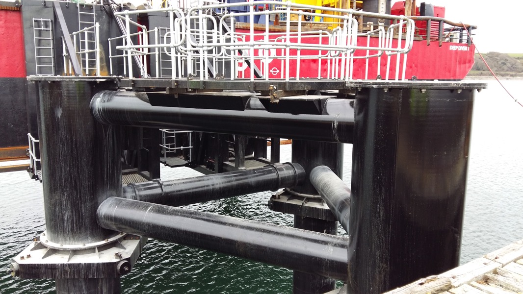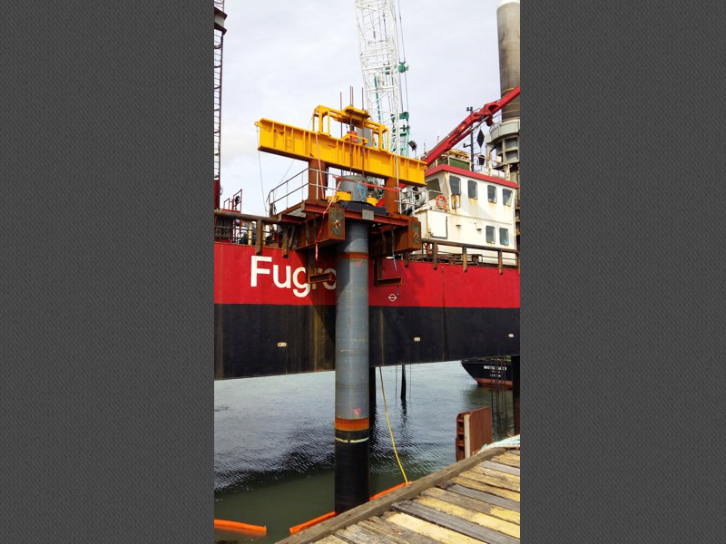 I was originally asked, by a firm of consultants, on this scheme to just design the piles for the proposed replacement jetty. The cost of that proposal was too high so my brief was enlarged to give general advice as to the design of the whole jetty. As a result the form of the jetty was changed to one with bridge units spanning between triangular dolphins placed alongside the existing timber jetty, at a saving of nearly £400,000. Pile design was interesting as it was through deep water into weathered slate and involved high tensile and lateral loads due to mooring and berthing forces. 1.2m tubular steel piles were used up to 40m long. They were installed using the drill drive method i.e. driven using a top hammer but if the design depth was not reached then the base of the pile was drilled out and the pile redriven. Due to the large number of load combinations involved and the variation of bed level, depth of weathered slate etc. the whole design was programmed and constantly updated from the results from site. Capwrap and pull out tests were used to prove the piles.