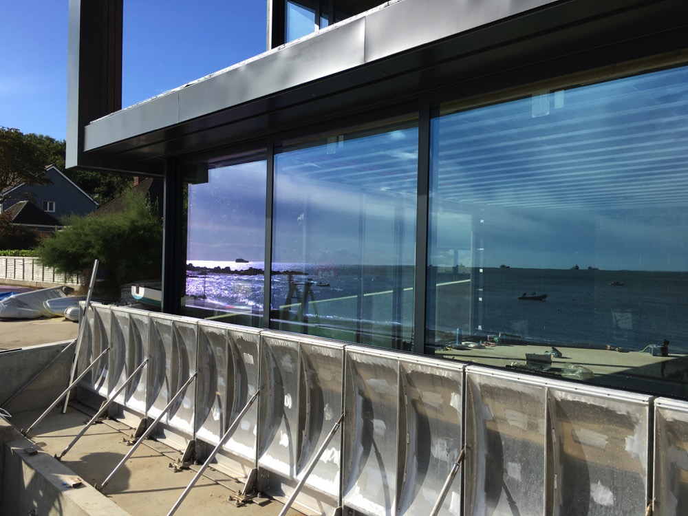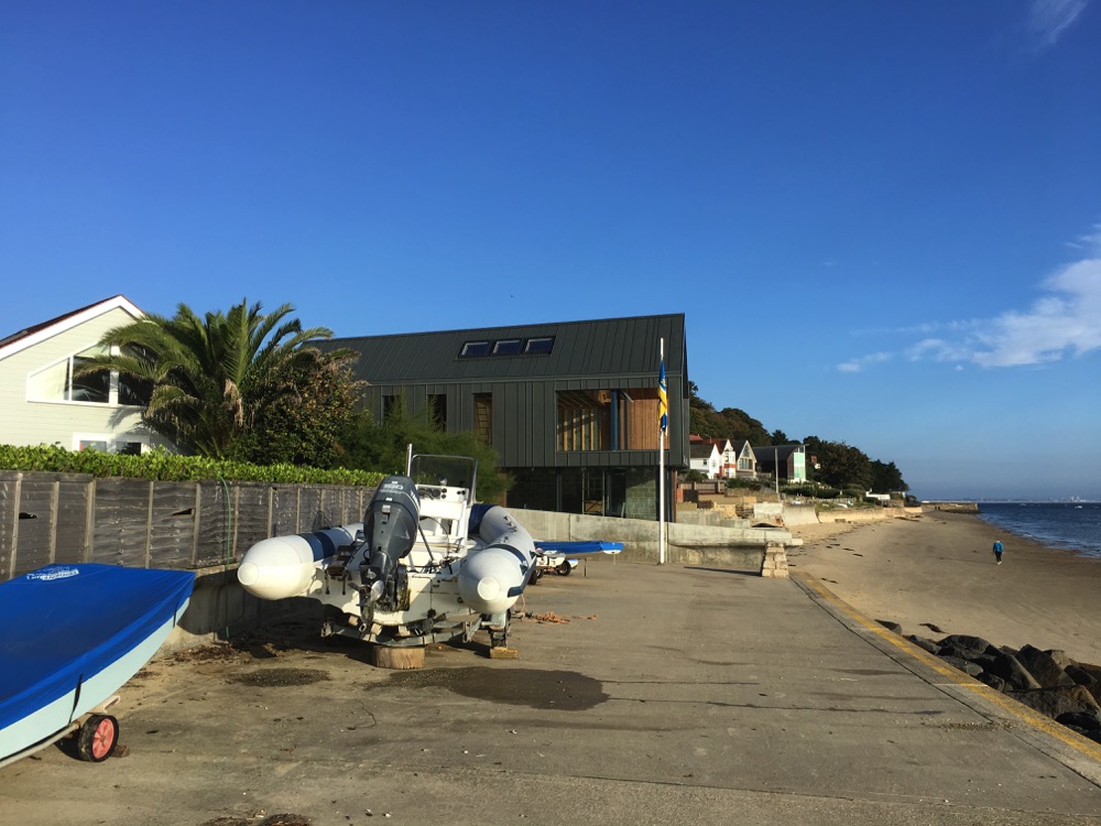 Seahaven is an interesting one off house built adjacent to the foreshore and slipway in Seagrove Bay. Its position means it is vulnerable to high tides and wind driven waves from the south east, especially if future sea level rise is taken into account. The shape of the site meant that the house plan had to be trapezoidal and the need to leave enough room on the ground floor for shutters and access meant that the upper floors overhang the ground floor by a varying amount. The client requirement for large uninterrupted glazing to the balcony on the east side and to the south east also drove the design.