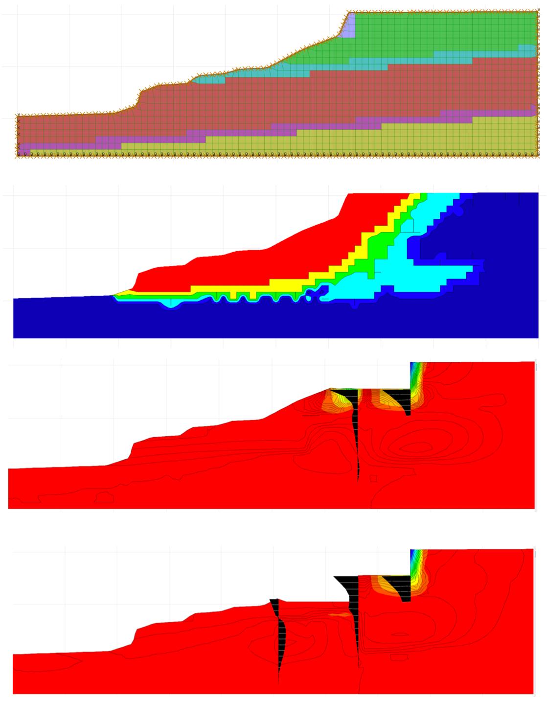 Then the factor of safety can be calculated. It is often helpful to produce a contour plot of the factors of safety on a site. The adjacent diagram shows a ground model followed by a fos plot where the fos varies from 1.0 (red)to 1.24 (blue). This plot agreed well with what could be seen on the ground but does extend a little further behind the existing rear scarp than was obvious, indicating the likelihood of further retreat.