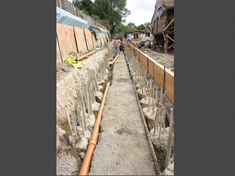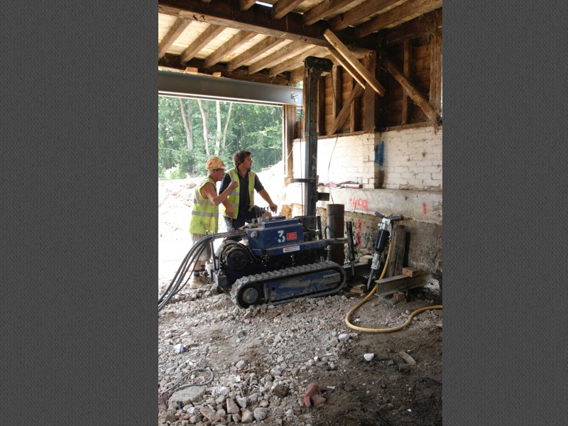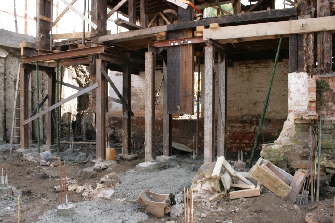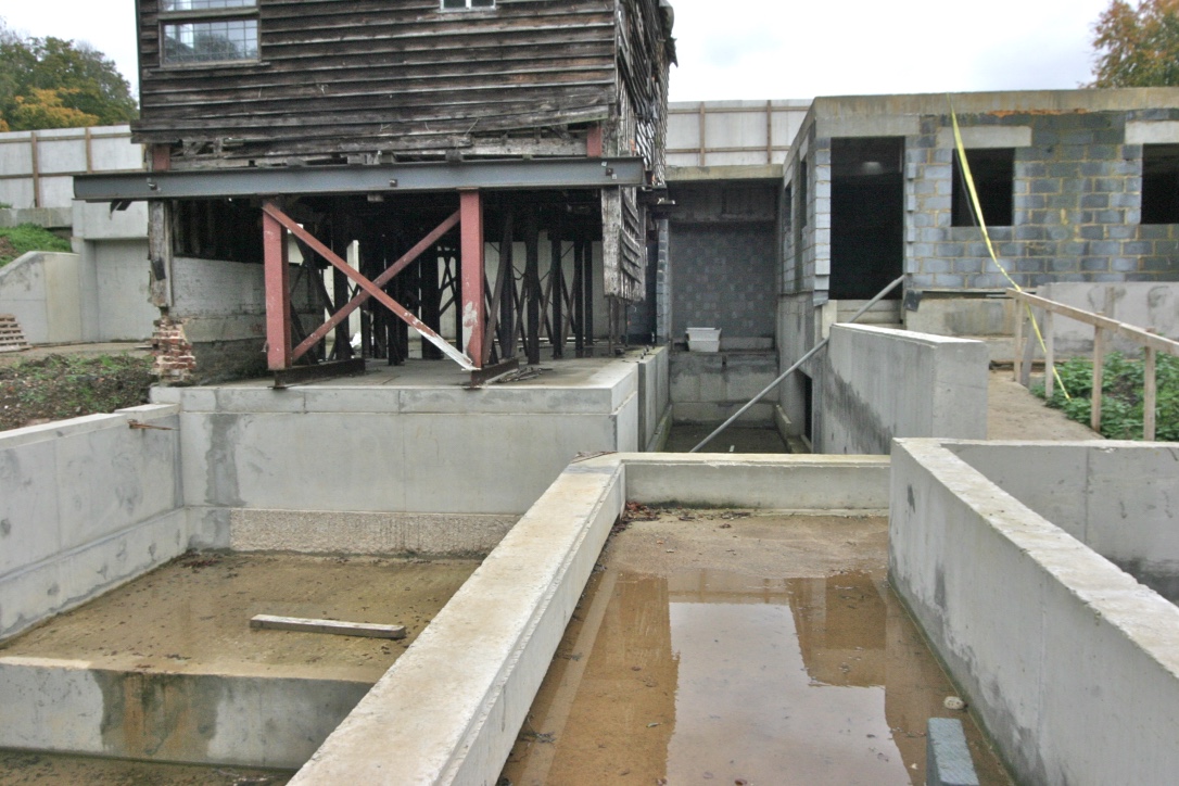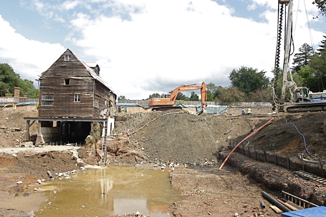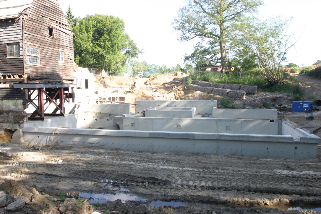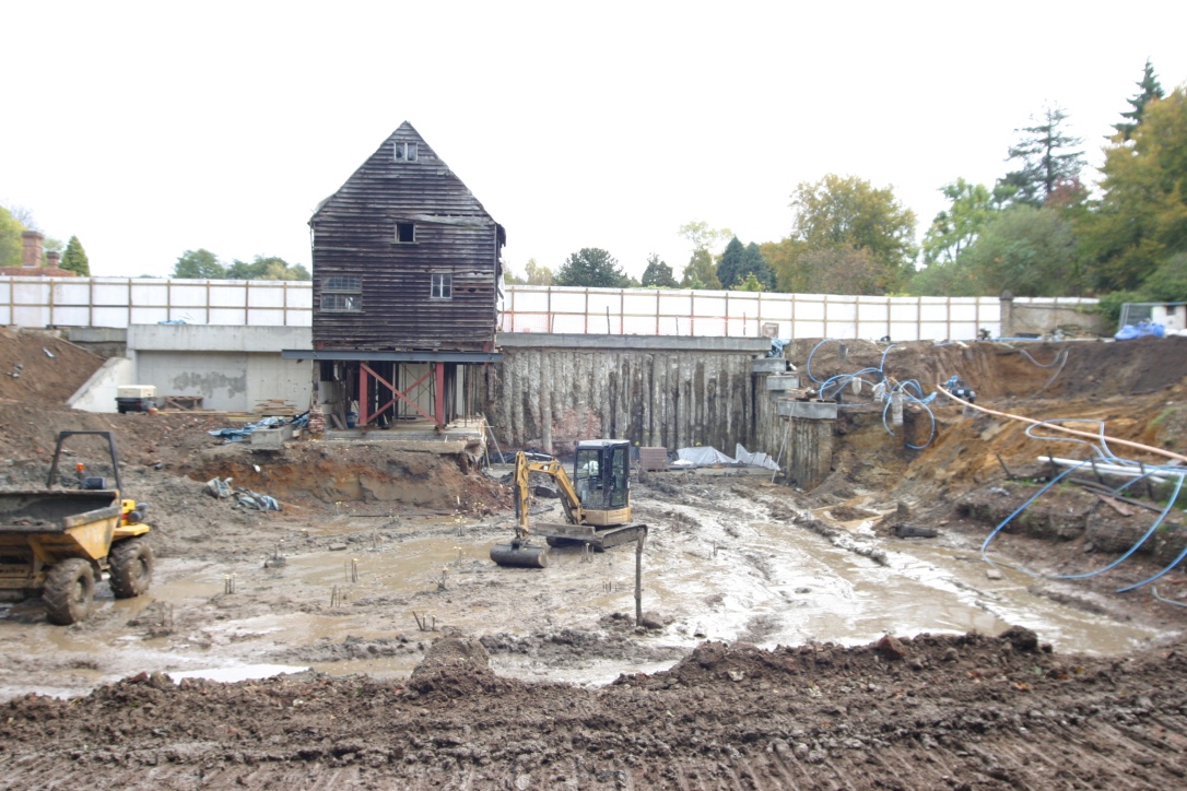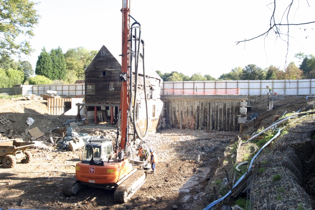 The mill was an old green oak building built into a dam holding back a large mill pond. The client wished to turn the mill into a house, complete with large inside/outside swimming pool, basement gym etc etc. In doing so, much of the existing building was demolished. That which remained had to be supported whilst the ground floor was lowered. The new wing was built into the dam and necessitated the construction of a secant piled retaining wall 7m high along the existing, narrow dam crest. Ground conditions were difficult, being mostly running sand, which necessitated extensive dewatering and piled anchors to prevent uplift.